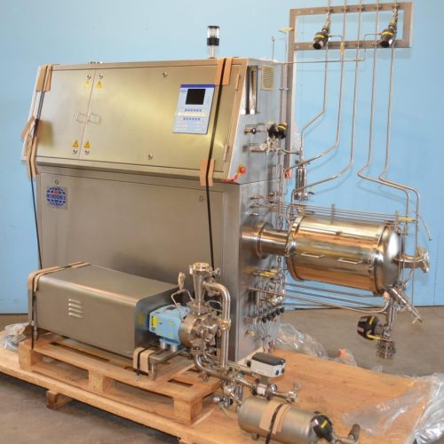 Unused Mondomix Model G75AS S/S Aerator Mixer with Waukesha Model 33 S/S Positive Displacement Pump. Maximum Product Capacity 800 Gallons per Hour, Aerated Product Capacity 1,600 Gallons Per Hour, Maximum Pump Capacity 1,000 Gallons Per Hour, Assumed 2,000 cps Viscosity.130-365 RPM Mixing Head Speed. Premixed Product is Fed to The Mondomix Feed Pump. This Pump Transports The Mass to The Mixing Head Whilst Injecting Nitrogen. The Nitrogen Injection System is Mass Flow Controlled and is Synchronized with The Main Feed Pump. This Synchronization Sees to it That When The Main Feed Pump Flow Rate is Increased, The Nitrogen Injection System Will Automatically Follow. Hence, the Density of the Product Remains the Same. The Product and Nitrogen Are Thoroughly Mixed/Homogenized in the Mixing Head. The Aerated Product is Fed to a Filler. Designed For Mixing Foaming Products. The Cutting Action of the Pins of the Stator and the Rotor Ensure a Regular Distribution of Air or Another Gas in the Product. The Air/Gas Dosing System Has Been Designed to Reduce the Density of Products By Injecting Air or Gas. The Mixing Head Pressure is Controlled, Irrespective of the Length and Diameter of the Discharge Pipe by the Mixing Head Pressure Regulator. All Stainless Steel Construction, Digital Touch Controls, Maximum Air Pressure 145 PSI, Maximum Steam Pressure 29 PSI, 460V, 3 Ph, 60 Hz.