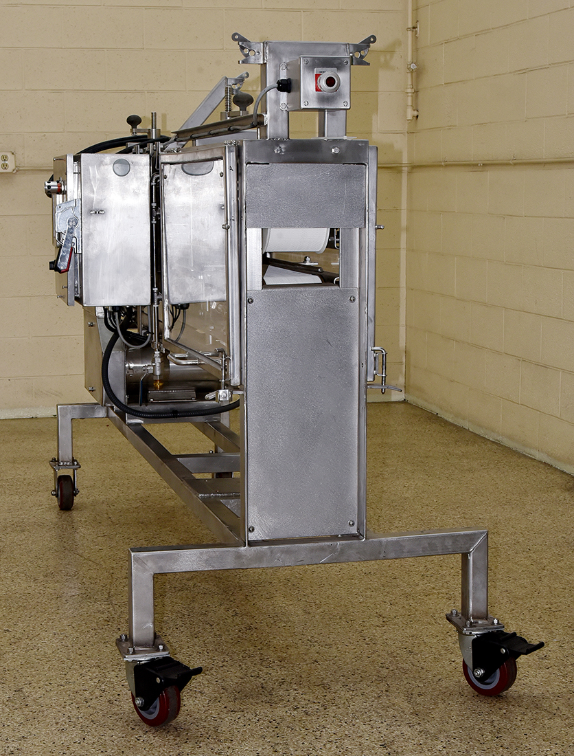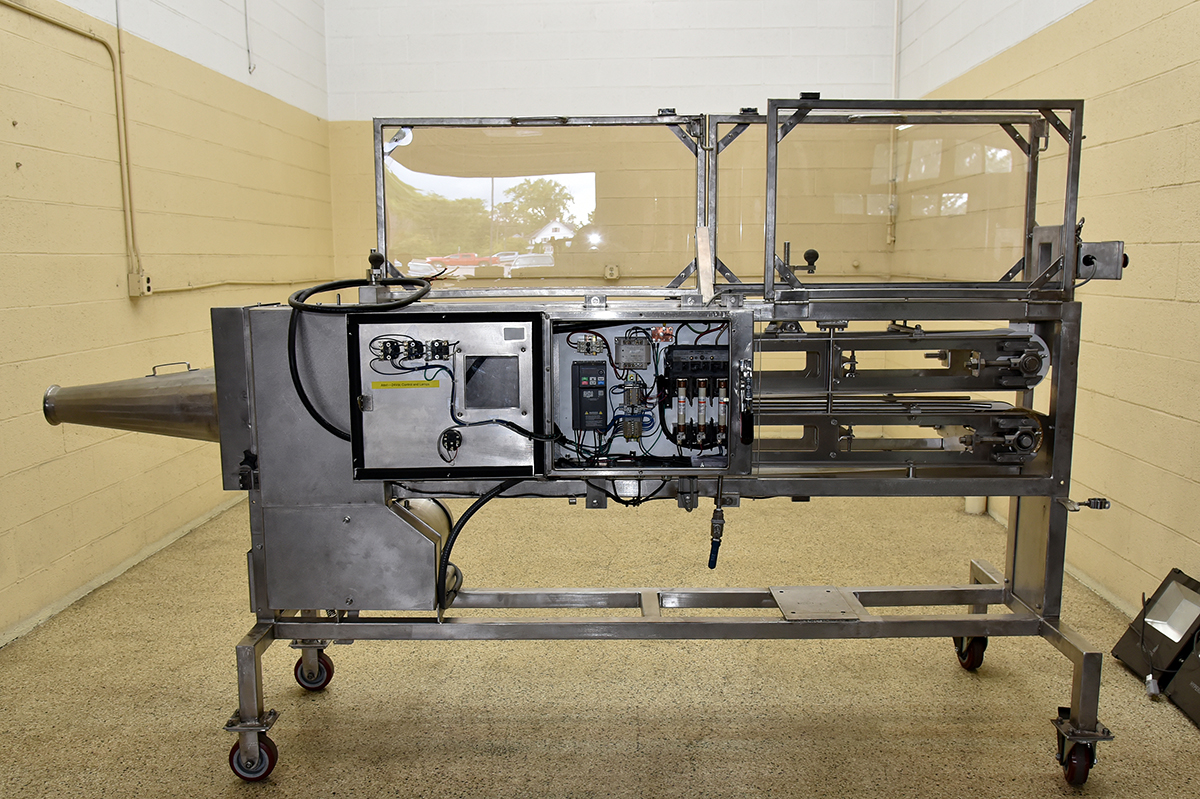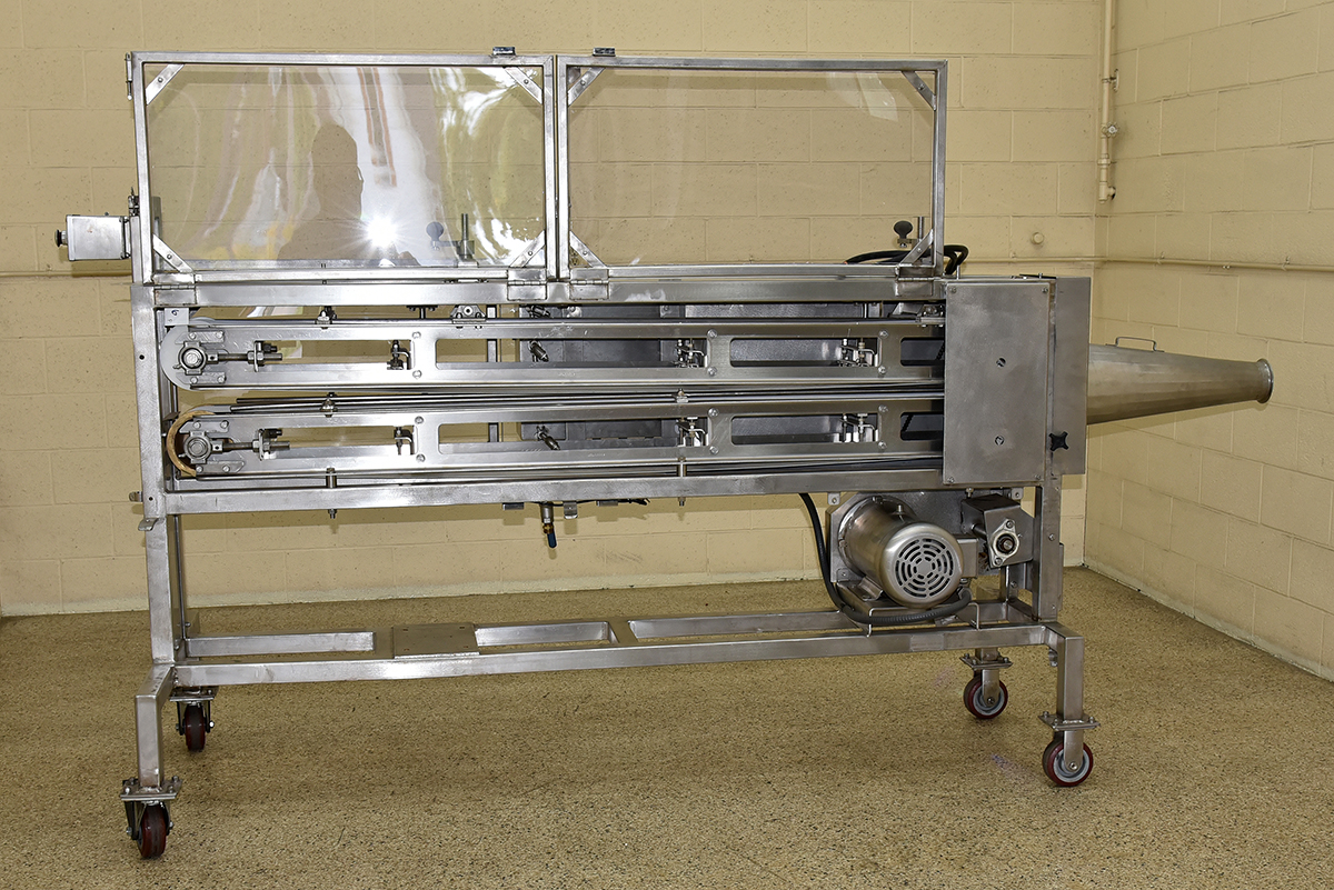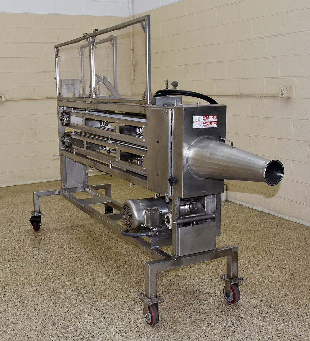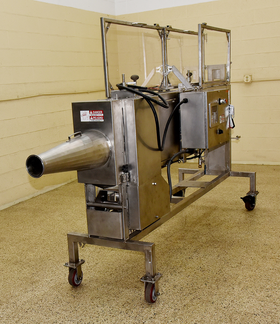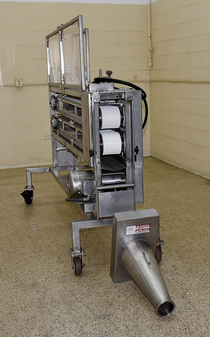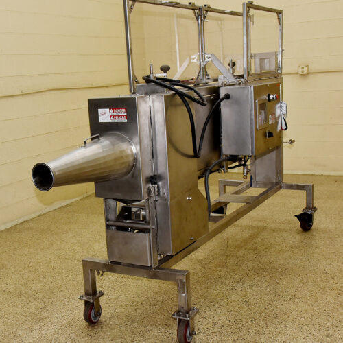Urschel Model VSC Stainless Steel Spear Cutter. Lengthwise slicer cuts square, rectangular, segment, spear, wedge, strip, stick & slab cuts from a variety of vegetables such as cucumbers / pickles, carrots, onions, zucchini, potatoes, peppers, and other vegetable products 4 inches or less in diameter which can be pushed at high velocity through a cutting grid. Inline straight-through feed high velocity cutter for industrial vegetable processing applications. A variety of cutting heads are available for flat or crinkle cut slabs, rectangular strips, square strips, and wedge / segment cuts. Standard cone discharge to reduce velocity of the cut product. Factory control panel with operator on/off controls. Safety interlock system, cuts power to drive if the machine’s guards are opened. Food grade sanitary stainless steel construction. 5 HP stainless steel shrouded motor with variable speed control. 208/230 volt, 3 phase.