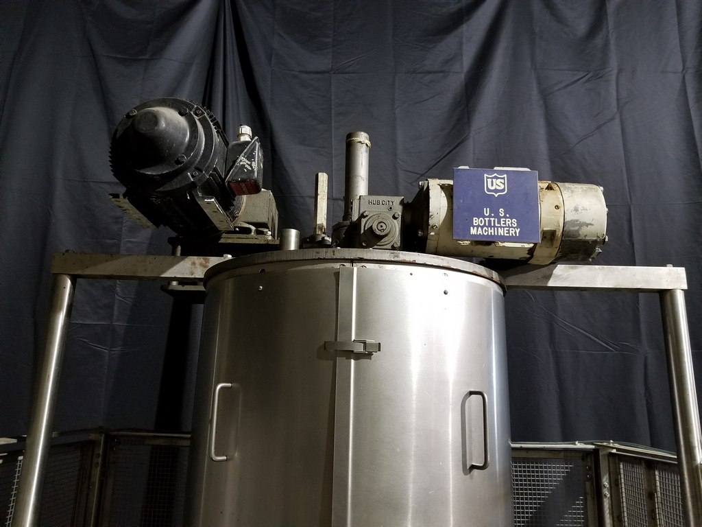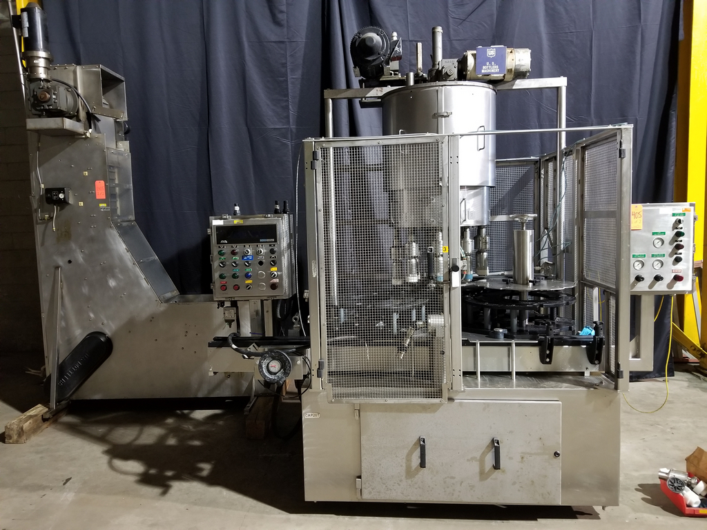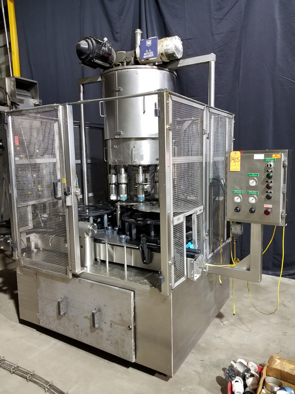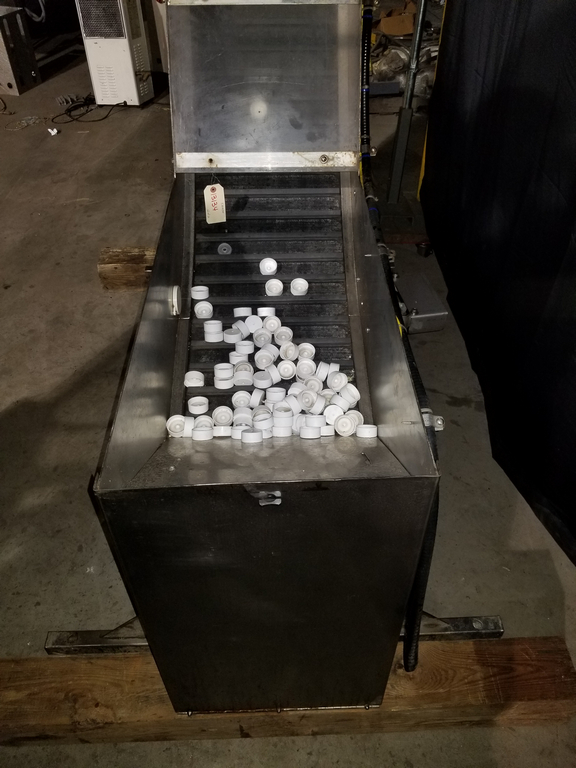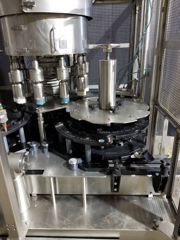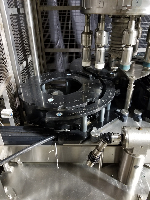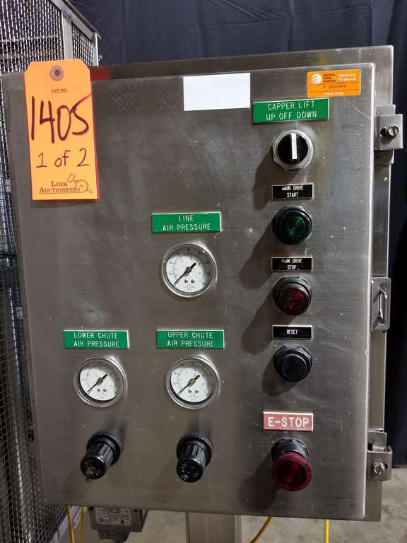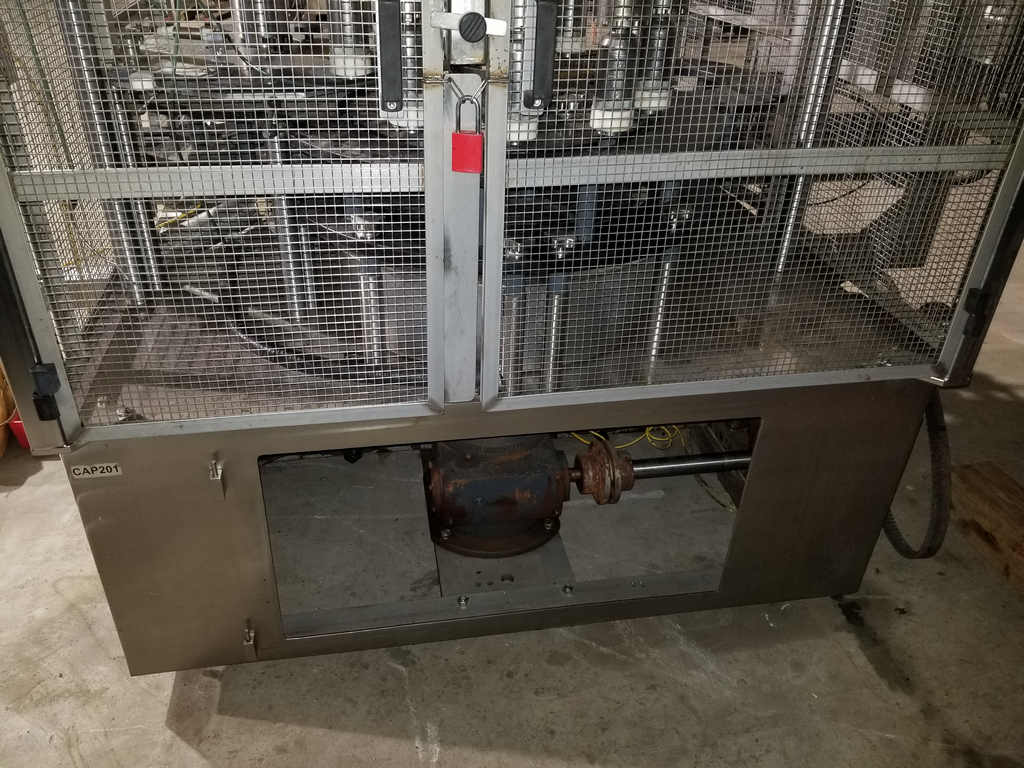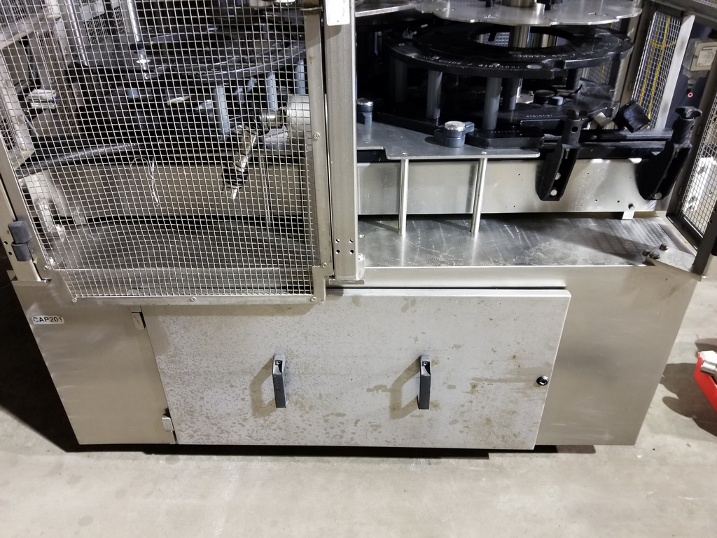 US Bottlers Model MC10SS (10) Head S/S Rotary Screw Capper. All Stainless-Steel Construction. 10 Capping Heads on 7 in Centers. New Style Warner All S/S Magnetic Clutches for Torque Control. Cap in Head Cap Transfer System. Includes All Stainless Elevator/Sorter. Container Travel Left to Right. 4-1/2 in Tabletop Conveyor Channel Through System. Conveyor Length 86 in. Infeed Star Diameter 22 in. Infeed Star has 10 Pockets. Discharge Star Diameter 22 in. Discharge Star has 10 Pockets. Overall Dimensions 107 in L x 56 in W x 108 in H.