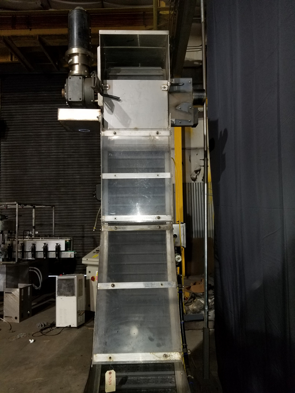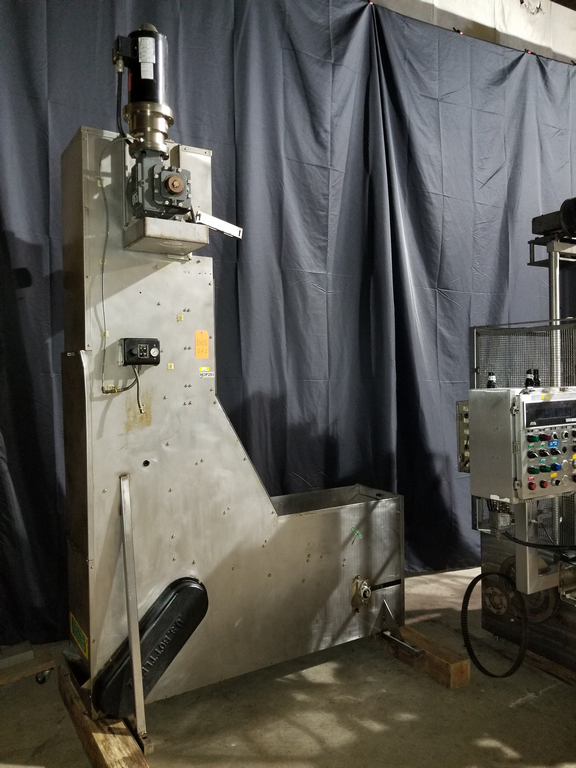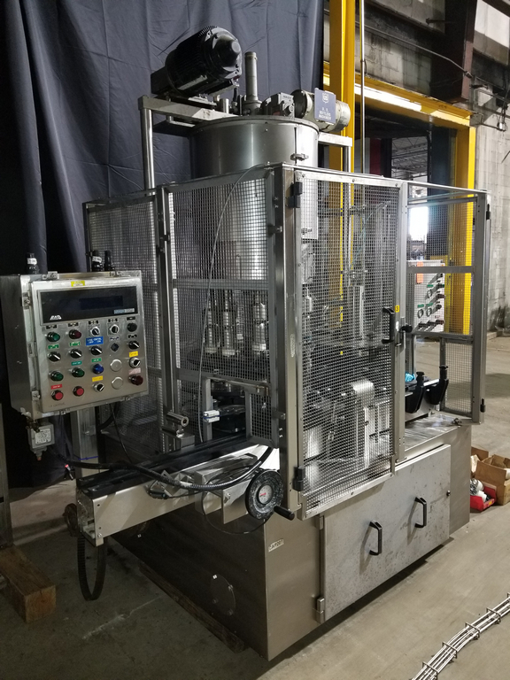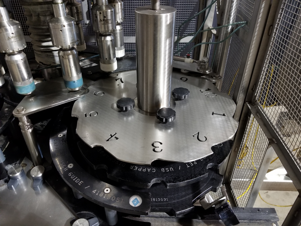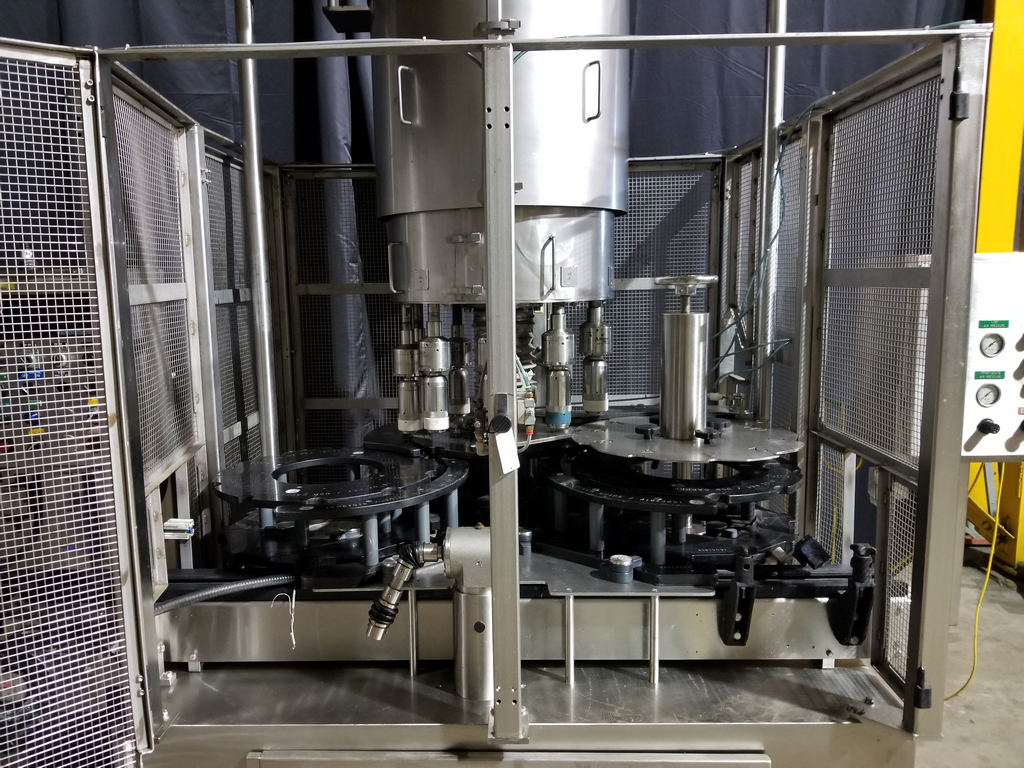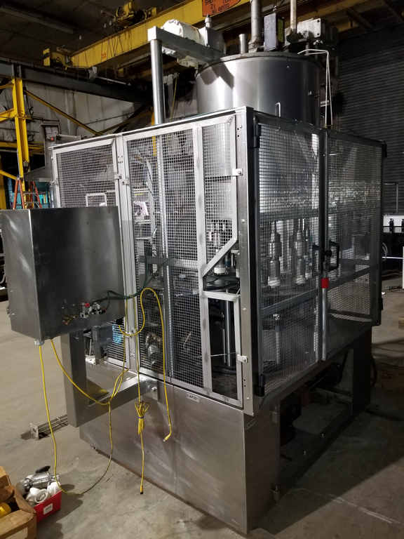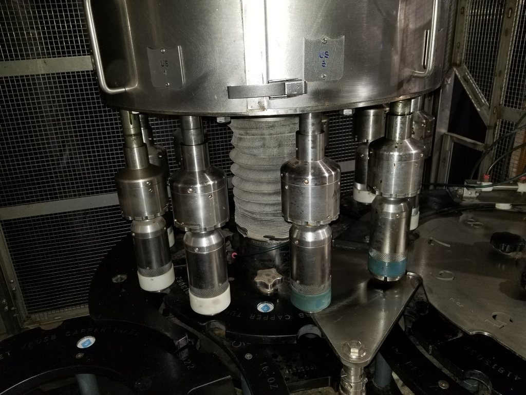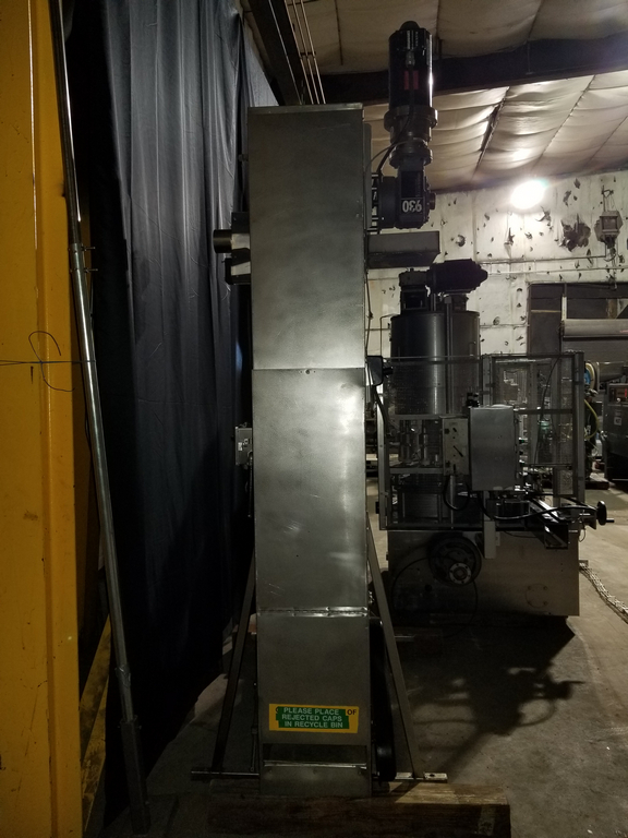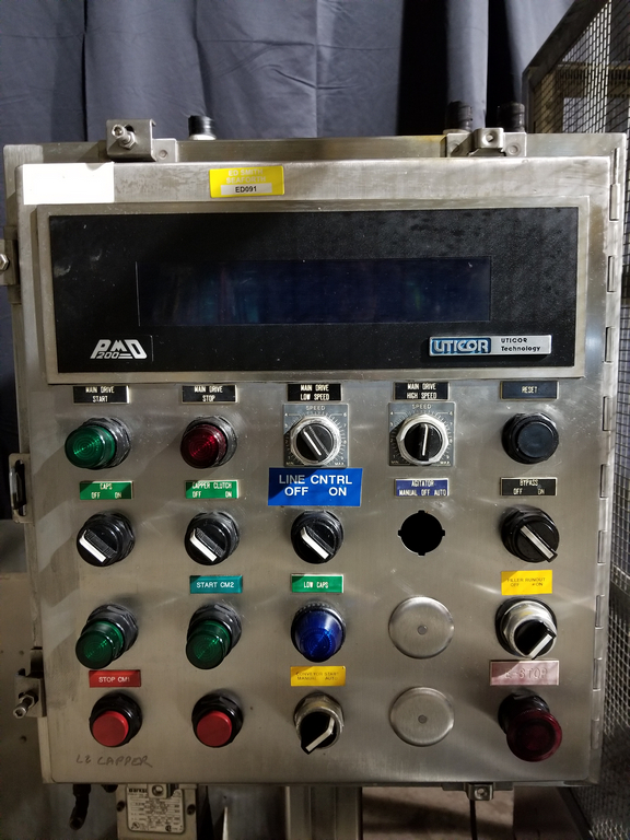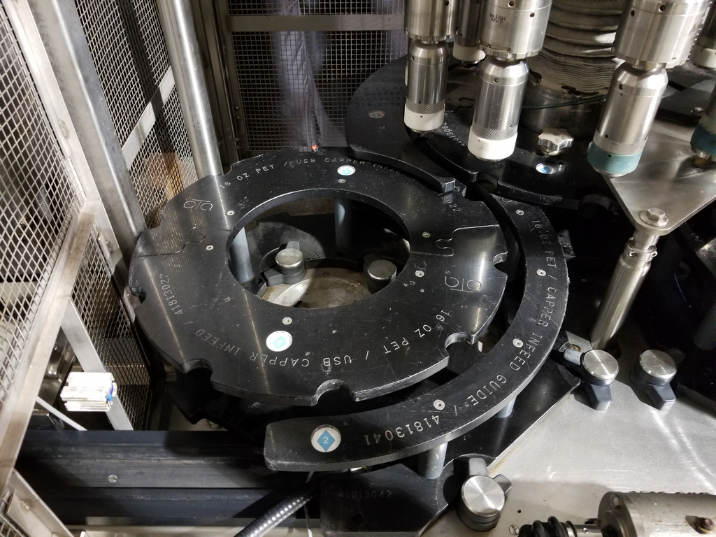 US Bottlers Model MC10SS (10) Head S/S Rotary Screw Capper. All Stainless-Steel Construction. 10 Capping Heads on 7 in Centers. New Style Warner All S/S Magnetic Clutches for Torque Control. Cap in Head Cap Transfer System. Includes All Stainless Elevator/Sorter. Container Travel Left to Right. 4-1/2 in Tabletop Conveyor Channel Through System. Conveyor Length 86 in. Infeed Star Diameter 22 in. Infeed Star has 10 Pockets. Discharge Star Diameter 22 in. Discharge Star has 10 Pockets. Overall Dimensions 107 in L x 56 in W x 108 in H.