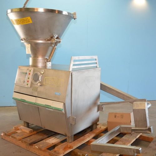 Vemag Model Robot HP10S Stainless Steel Vacuum Stuffer with Trolley Hoist. Type 140/250-B-1. Double screw for flexible use, Filling output rate of up to 7,000 kg per hour, Portion weights from 5 g up to 60,000 g, Approx 450 portions per minute depending on weight (25g at 450 ppm, 200g at 215 ppm), attachment, and number of links. 350 L S/S split hopper with feed screw (45.5 in outside diameter). Double screw design transports even raw materials containing large pieces especially gently all the way from the inlet to the outlet of the machine without a compression zone. Graphical user interface control for intuitive operation of the vacuum filler and control of downstream attachments (line function). Simple cleaning thanks to easily accessible components and a hygienic design. 230/460 V (wired 460 V), 3 Ph, 60 Hz.