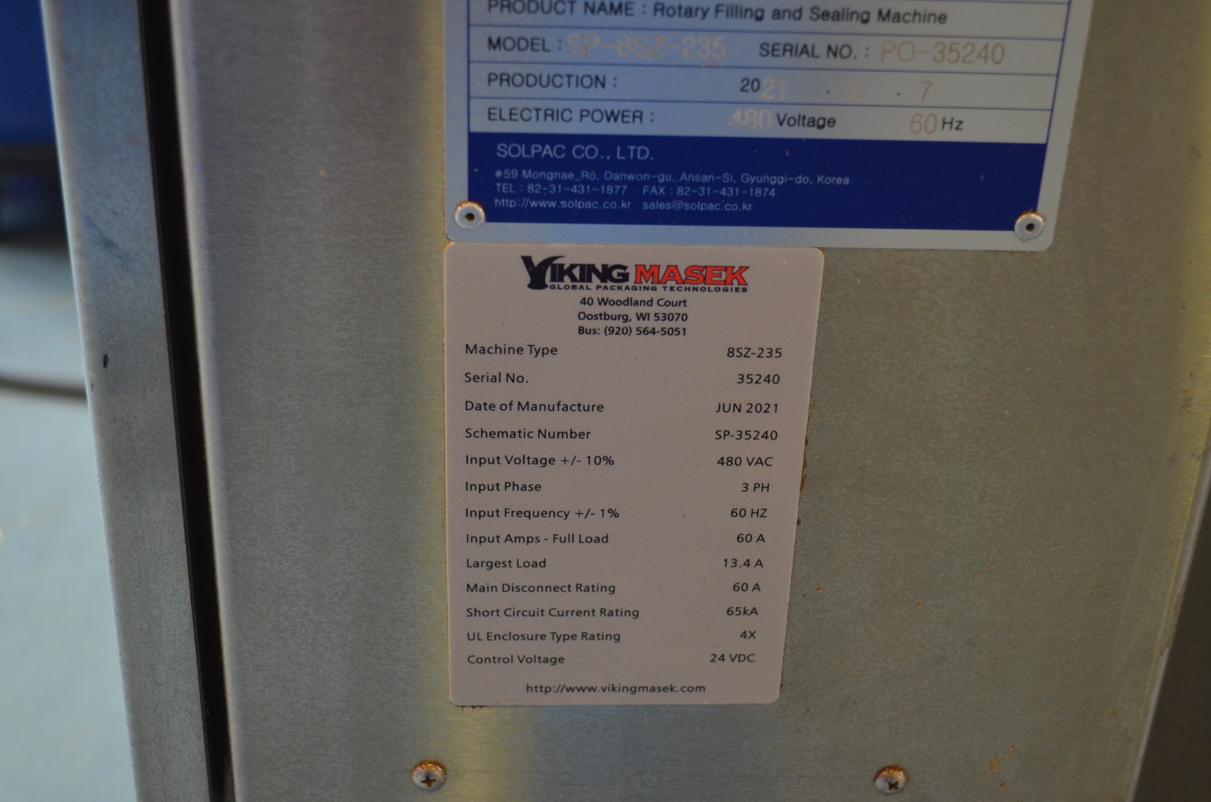 Viking Solpac Model SP8SZ-235 (S/N PO-35240) Stainless Steel Pre-Formed Pouch Filler and Sealer with 8-Position Turret, 60 Inch Long x 11 Inch Wide Infeed Pouch Conveyor with Banjo Belt and Adjustable Side Rails, Pneumatic Pouch Placer with (2) Suction Cups, Top Pouch Spreader, Pouch Opener, Secondary Pouch Spreader, 10 Inch Diameter Stainless Steel Fill Hopper with 2 1/4 Inch Diameter Discharge, Heat Seal Station with 10 Inch Long Heat Seal Bar, 40 Inch Long x 10 Inch Wide Discharge Conveyor with Flat Vinyl Belt, Allen Bradley PanelView Plus Touch Screen HMI. Includes AS&E Supply and Engineering Model M35 Stainless Steel Auger Filler with 20 Inch Diameter Stainless Steel Agitated Feed Hopper with Bolt Down Cover, 6 Inch Diameter Top Infeed, 3 Inch Diameter Discharge, Stand Alone PLC/HMI Controls (S/N 2019) (Year 2021), Including Outboard Scale with 12 Inch x 12 Inch Stainless Steel Platform with Controls and Red Lion Touch Screen HMI, Apple Inner Hopper Mounted Camera with 8 Inch Monitor.