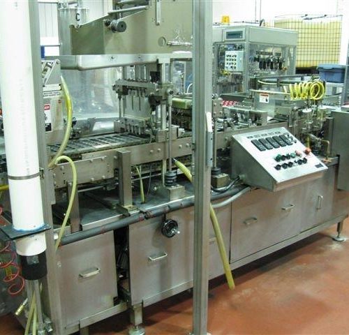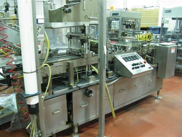 WA Lane Model 678 5 Lane Cup Filler. 11 3/4in W, 5 x 10 up. Cup size 1 7/16in x 2in. 10 Packages per cycle. Cycles per minute 30-60. Fill volume range 1/4 to 9/16 fl. oz. Fill temperature range 40-175 degrees F. 220V, 3 Ph, 60 A. 3/4in dia pistons, discharge takes 50/cycle and transfers to conveyor, Thiele 20-812 recip placer. s/n 7928, built 1994 - for feeding cups to tooling. Elec: 3/60/230V 60 Amp --- Automatic linear motion suction cup arm packs cup/trays into trays.