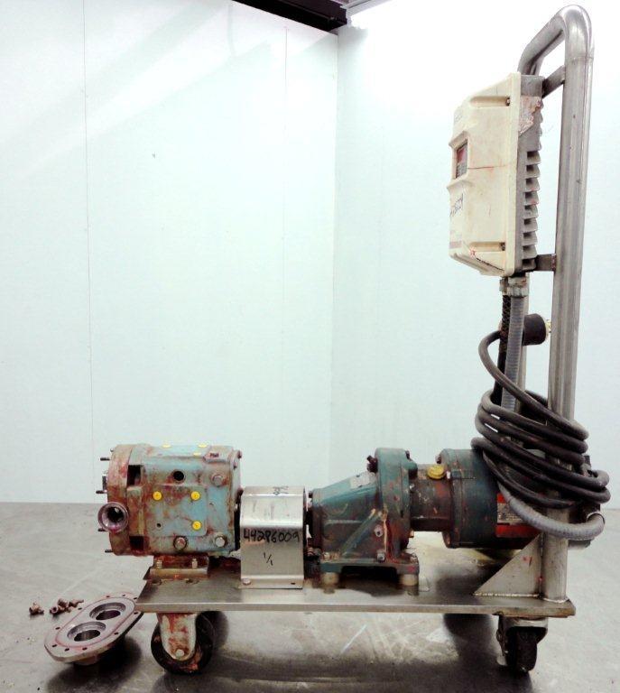 Waukesha Model 006 3/4 HP 316 Stainless Steel Rotary Positive Displacement Pump. Approximately 6 Gallons Per Minute at 200 PSI at 800 RPM Capacity, (.0082) Gallon Displacement Per Revolution. 1 1/2 in Diameter Tri-Clamp Inlet and Outlet, with EZ Clean Plus SP500 Power Supply, 230/460V, 2.2/1.1 Amp, 3Ph, 60Hz, 1725 RPM, 2.7 to 1 Ratio, Mounted on Portable S/S Cart.
