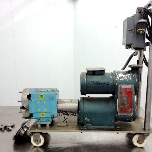 Waukesha Model 030 3/4 HP 316 Stainless Steel Rotary Positive Displacement Pump with Pressure Relief Valve. Approximately 36 Gallons Per Minute at 100 PSI at 600 RPM Capacity, (.06) Gallon Displacement Per Revolution. 1 1/2 in Diameter Tri-Clamp Inlet and Outlet, with Reeves XV Variable Speed Drive Motor, Cuttler Hammer Power Supply, 230/460V, 3Ph, 60Hz, 2.2/1.1 Amp, 1725 RPM, Mounted on Portable S/S Cart.