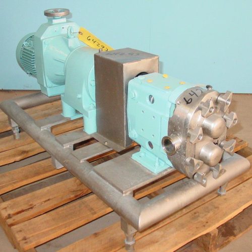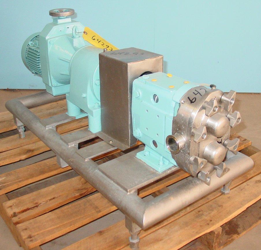 Waukesha model 30 positive displacement pump, w/ air seals, 1 1/2 in triclamp inlet and outlet, 70 gallons per minute at 300 PSI. 2 Hp 3/230/460/60 vari speed drive 5.16 ratio gear box, S/S stand