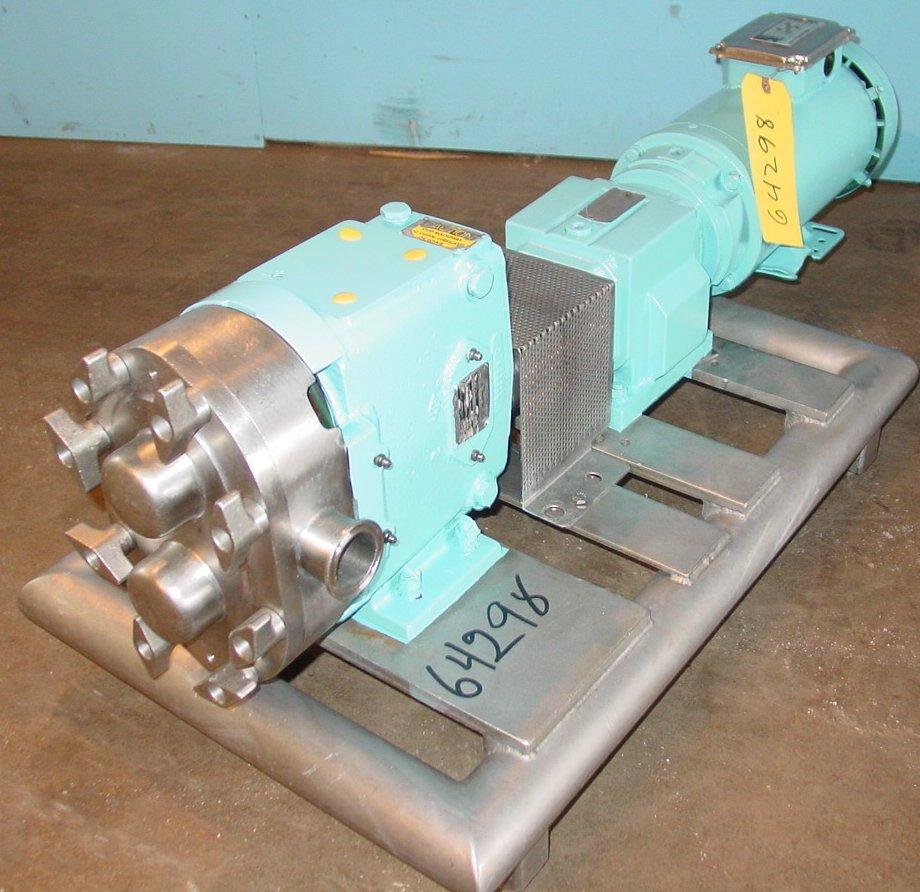 Waukesha model 30 positive displacement pump, 1 1/2 in triclamp inlet and outlet, 3 Hp 3/60/208-230/460 drive 6.16 ratio gear box, S/S stand