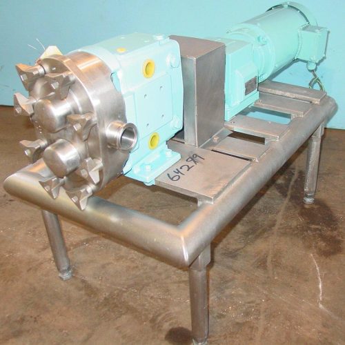 Waukesha model 30 positive displacement pump, 1 1/2 in tri clamp inlet and outlet, 70 gallons per minute at 300 PSI. 2 Hp 3/230/460/60 S/S drive 9.70 ratio gear box, S/S stand