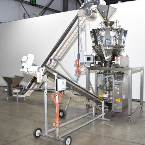 WeighPack Vertek JR Vertical Form, Fill and Seal Machine with (8) Head CombiScale. Capable of speeds up to 50 cycles per minute depending on application. Bag size range: 2 in to 5.5 in (3.75 cm to 12.5 cm) width: 3 in - 8 in (80-200 mm) length. Former's for finished bag width: 5 in, 3 3/4 in, and 2 1/2 in. Fill conveyor with level control and frequency drive. Take-away conveyor with frequency drive. 208/240 V, 1 Ph, 60 Hz, 15 Amp.