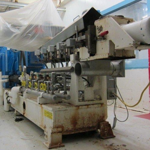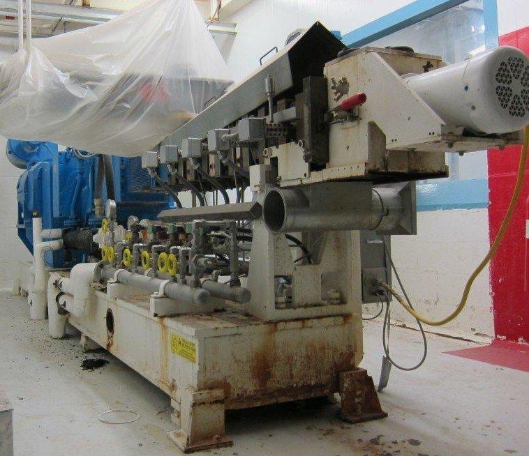 Werner and Pfleiderer 250HP Model ZSK70MC Mega Compounder Twin Screw Extruder. Screws operate at approx 560 RPM. 3.13:1 Ratio. With control panel and flying knife cut off, large assortment of spare parts available. Last running at a capacity of 8 kg per minute.