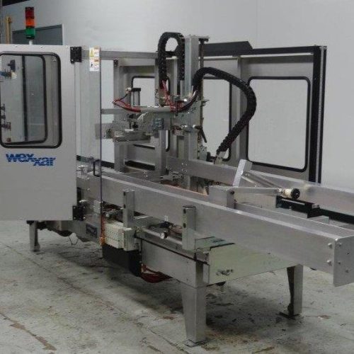Wexxar Model WF2TR Automatic Case Erector with Bottom Tape Sealer. Production Speed up to 30 CPM. Right to Left Configuration. Capable of Running RSC, HSC or CSSC Case Styles. Case Size Range: 7 in - 24 in Long, 5 in - 17 in Wide, 5 in - 16 in High. 70 in L Case Magazine with (2) Feed Belts. Case Magazine Height 33 in. Discharge Height 27 in. Dekka 3 in W Bottom Tape Head. 3 in H x 32 in L Vertical Transport Side Cary Belts. Allen Bradley MicroLogix 1200 PLC. Air Requirement 0.3 Cu Ft Per Cycle at 90 PSI. 460 V, 3 Ph, 60 Hz, 2.5 Amp, 1/2 HP.