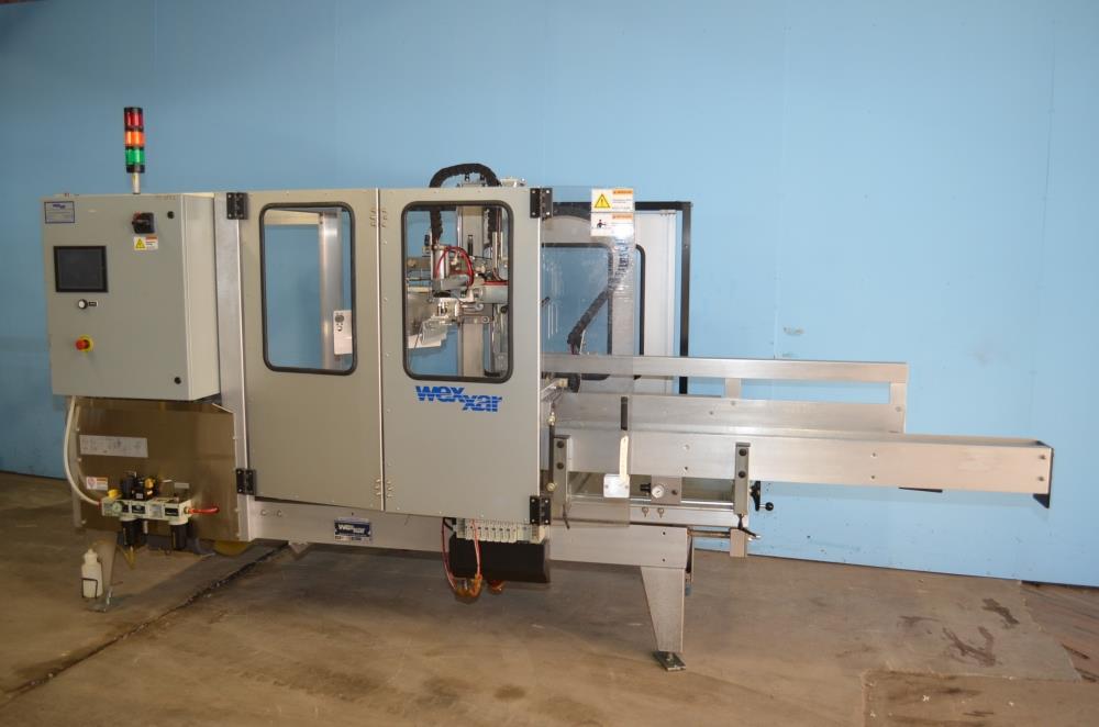 Wexxar Model WF2TR Automatic Case Erector with Bottom Tape Sealer. Production Speed up to 30 CPM. Right to Left Configuration. Capable of Running RSC, HSC or CSSC Case Styles. Case Size Range: 7 in - 24 in Long, 5 in - 17 in Wide, 5 in - 16 in High. 70 in L Case Magazine with (2) Feed Belts. Case Magazine Height 33 in. Discharge Height 27 in. Dekka 3 in W Bottom Tape Head. 3 in H x 32 in L Vertical Transport Side Cary Belts. Omron Model VS8TV00BV2 Digital Touch HMI. Allen Bradley MicroLogix 1200 PLC. Air Requirement 0.3 Cu Ft Per Cycle at 90 PSI. 460 V, 3 Ph, 60 Hz, 2.5 Amp, 1/2 HP.