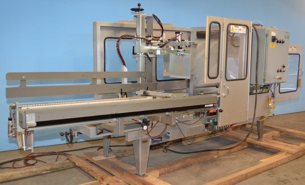 Wexxar WFT Automatic Case Former Erector With 2.5 in Wide Bottom Tape Head, Left to Right Configuration, 3 in H Side Carry Belts. Capable of speeds up to 20 CPM. Case Size Range: Length: 7 in to 22 in, Width: 6 in to 17 in, Height: 6 in to 20 in. Minimum Case Blank Size: 16 in Long x 12 in High. Maximum Case Blank Size: 36 in Long x 26.5 in High. 72 in Long Fully Adjustable Case Magazine with Twin Screw Style Magazine Feed. Fully Mechanical Pin Style Erecting Action With No Vacuum Cups. Machine Footprint 13 ft L x 5 in W x 98 in H. 460 V, 3 Ph, 60 Hz.