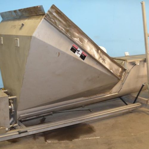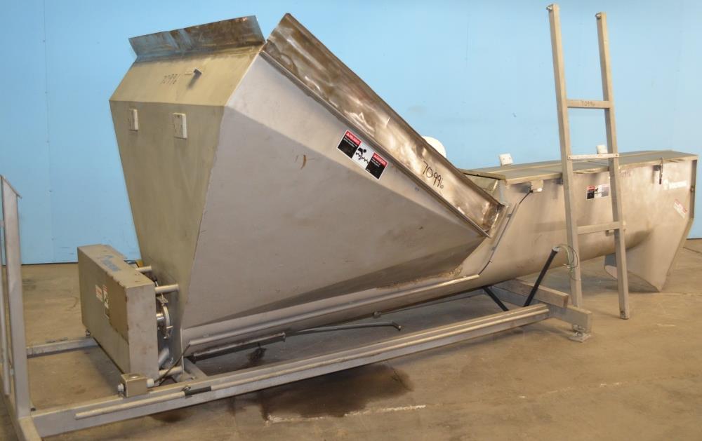 Wolfking Model SC400X14 16 in Diameter x 12 Foot Tall S/S Incline Screw Conveyor. 16 in Diameter Screw, 16 in Centers, 4.5 in Diameter Shaft, 14 ft Total Screw Length (6 ft in Hopper, 8 ft in Trough), Hinged Clamp Down Trough Cover, 60 in x 60 in x 75 in S/S Hopper, Approx 12 ft Discharge Height, S/S Frame, 7.5 HP Drive, 460 V, 3 Ph, 60 Hz, 1765 RPM, 18.8/9.4 Amp, Gearbox Ratio 43.70.
